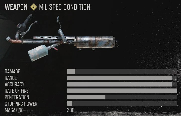 The Military Flamethrower is used by enemy NPCs, and via mods, the player can use it since it has unlimited ammunition, it can still rapidly burn and kill enemies quickly, setting them on fire despite the low damage. It can still overwhelm and set Freaker hordes and nests on fire, at the cost of letting the Freakers gang up on the player in doing so. The flame spray range on this weapon is long to reach moderate distance.
