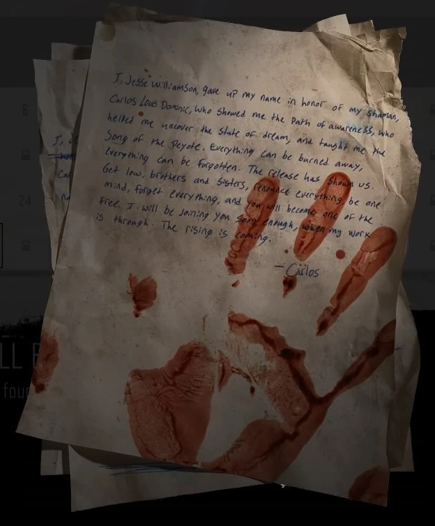 I, Jessie Williamson, gave up my name in honor of my shaman, Carlos Louis Dominic, who revealed to me the One Mind, who helped me uncover the state of dream, and taught me the song of the Peyote. Everything can be burned away, everything can be forgotten. The Release has shown us. Get low, brothers and sisters, renounce everything, be one mind, forget everything, and you will become one of the Free. I will be joining you, soon enough, when my work is through. The Rising is coming. Carlos