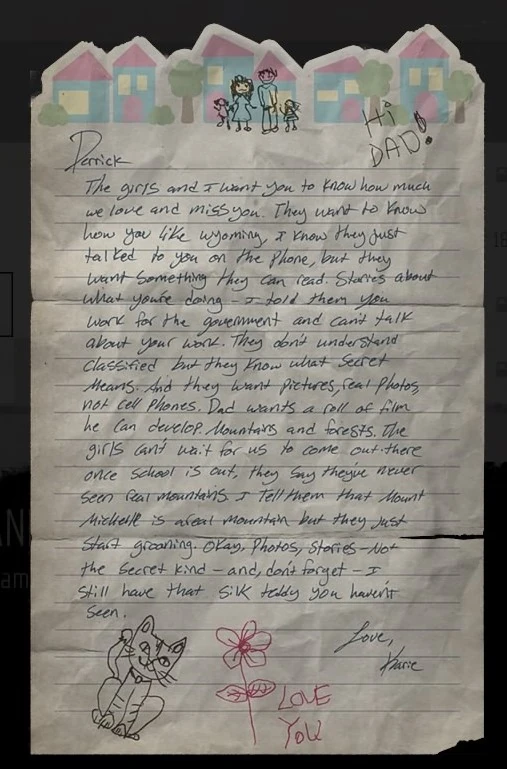 Derrick — the girls and I want you to know how much we love and miss you. They want to know how you like Wyoming, I know they just talked to you on the phone, but they want something they can read. Stories about what you're doing. I told them you work for the government and can't talk about your work. They don't understand classified, but they know what secret means. And they want pictures, real photos, not cell phones. Dad wants a roll of film he can develop. Mountains and forests. The girls can't wait for us to come out there once school is out, they say they've never seen real mountains. I tell them that Mount Michelle is a real mountain, but they just start groaning. Okay, photos, stories — not the secret kind — and don't forget — I still have that silk teddy you haven't seen. Love, Karie