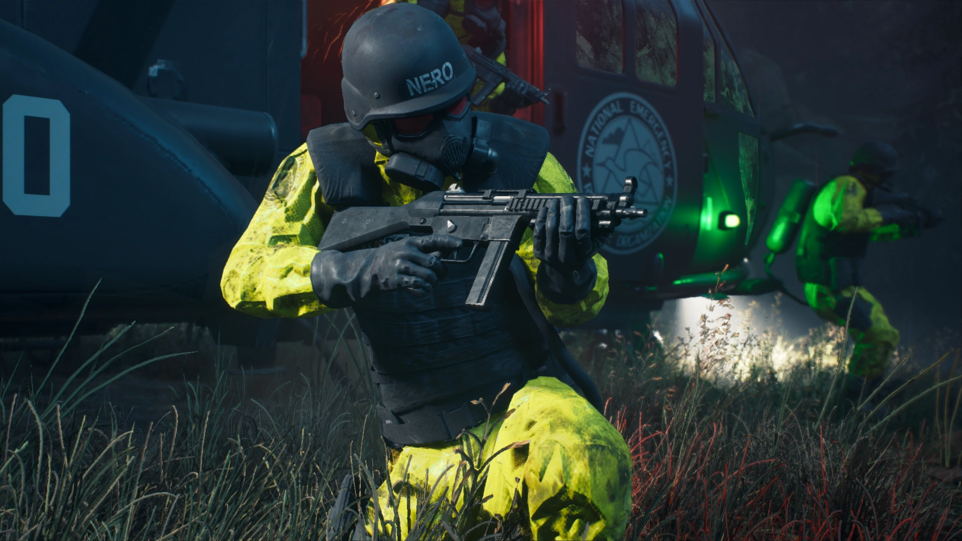 After all social order disappeared, NERO remained active. During the game, two years later, NERO helicopters continue to periodically venture into the area, deploying teams of soldiers and researchers to study the progression of the virus. NERO personnel no longer attempt to maintain law and order or even protect remaining civilians, opting to instead monitor the progress of the infection from their safe zones.