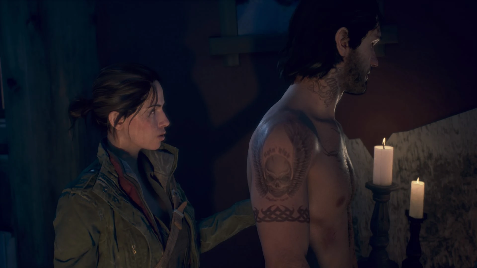 The infirmary is empty, so Rikki begins treating Deacon's wound, prompting a discussion about his tattoos. Rikki implies that she would like a relationship with Deacon, but he gently turns her down. Unbeknownst to them, Skizzo sees them sharing a moment with Deacon's shirt off before wandering into the night. Seeing that Deacon isn't ready for her advances, Rikki instead offers to resume when he is ready, and to "light a candle" when he grows tired of being out in the cold and darkness.