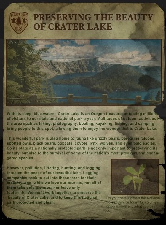 However, pollution, littering, hunting, and logging threaten the peace of our beautiful lake. Logging companies seek to cut into these tress for their industry and, while we love our tourists, not all of them take only pictures, nor leave only footprints. We must work together to preserve the beauty of Crater Lake, and to keep this national park protected and clean.